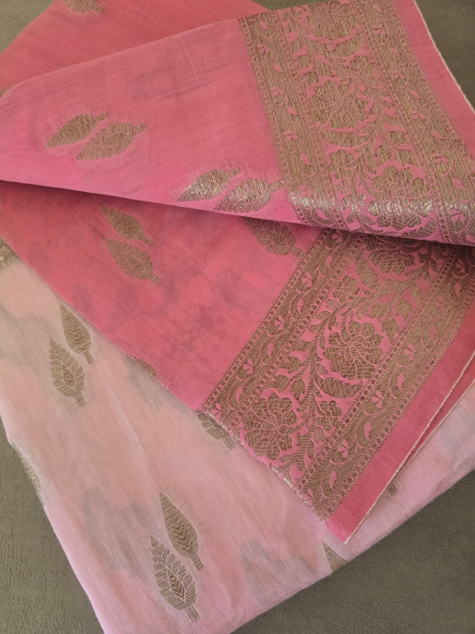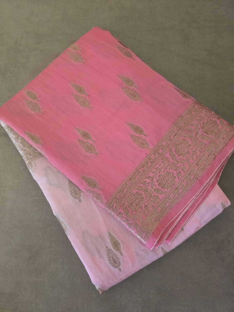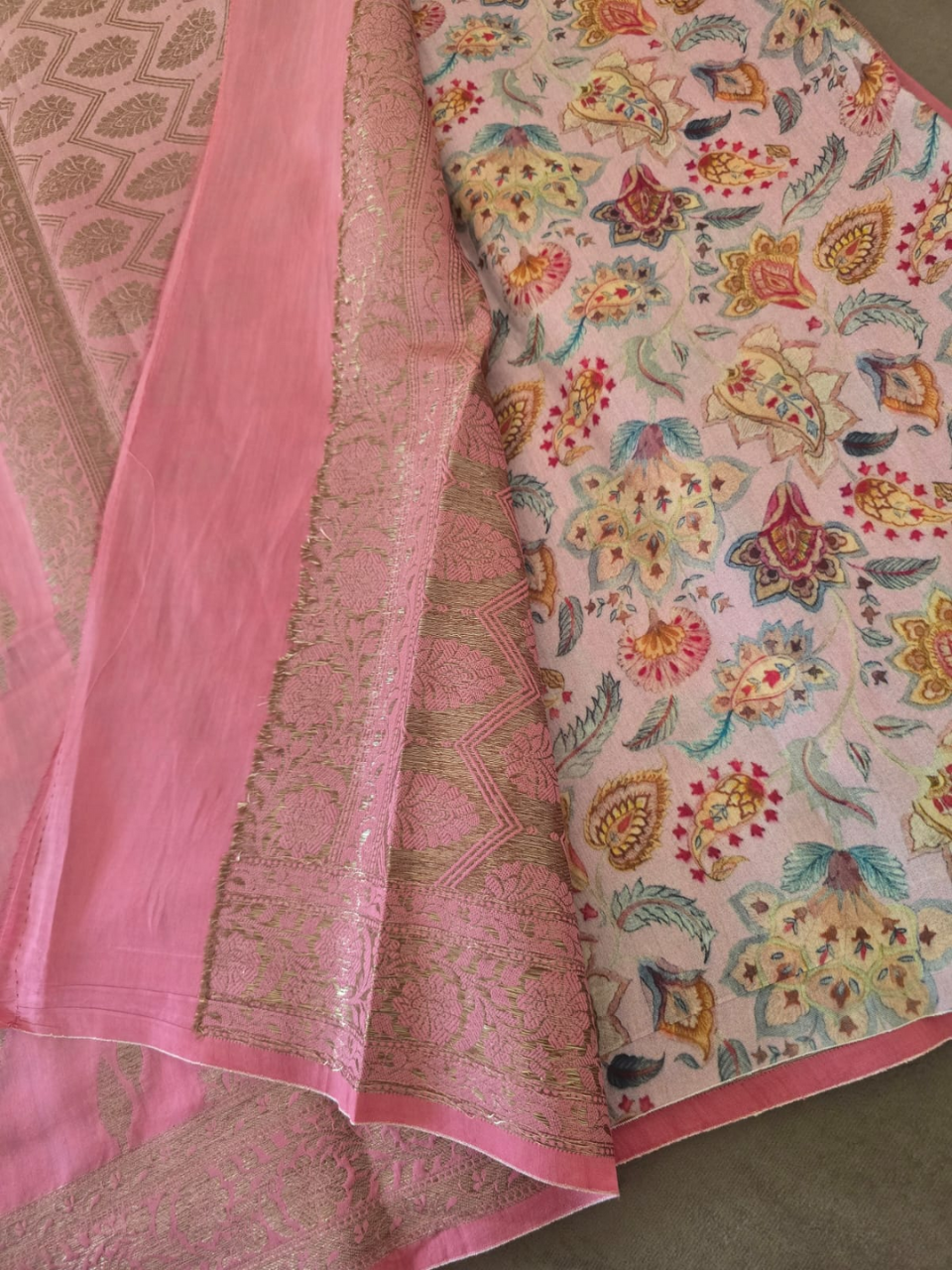 Grace meets heritage in this pink saree, featuring classic Banarasi-style woven motifs in soft rose gold zari. The highlight is the contrasting printed blouse piece, adorned with colorful floral bunches that add a playful charm to the rich traditional body. Perfect for festive wear, cultural functions, or elegant gatherings.